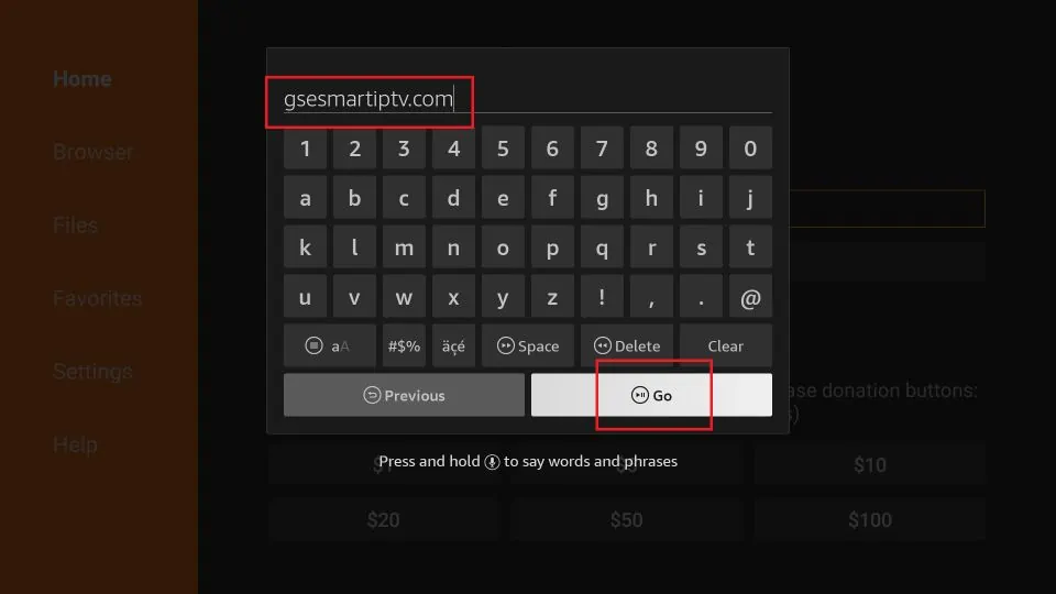 3. We now use this onscreen keyboard to enter the following path: https://www.gsesmartiptv.com OR, simply use the shortened version of this URL gsesmartiptv.com (as you see in the image below). Click GO.
